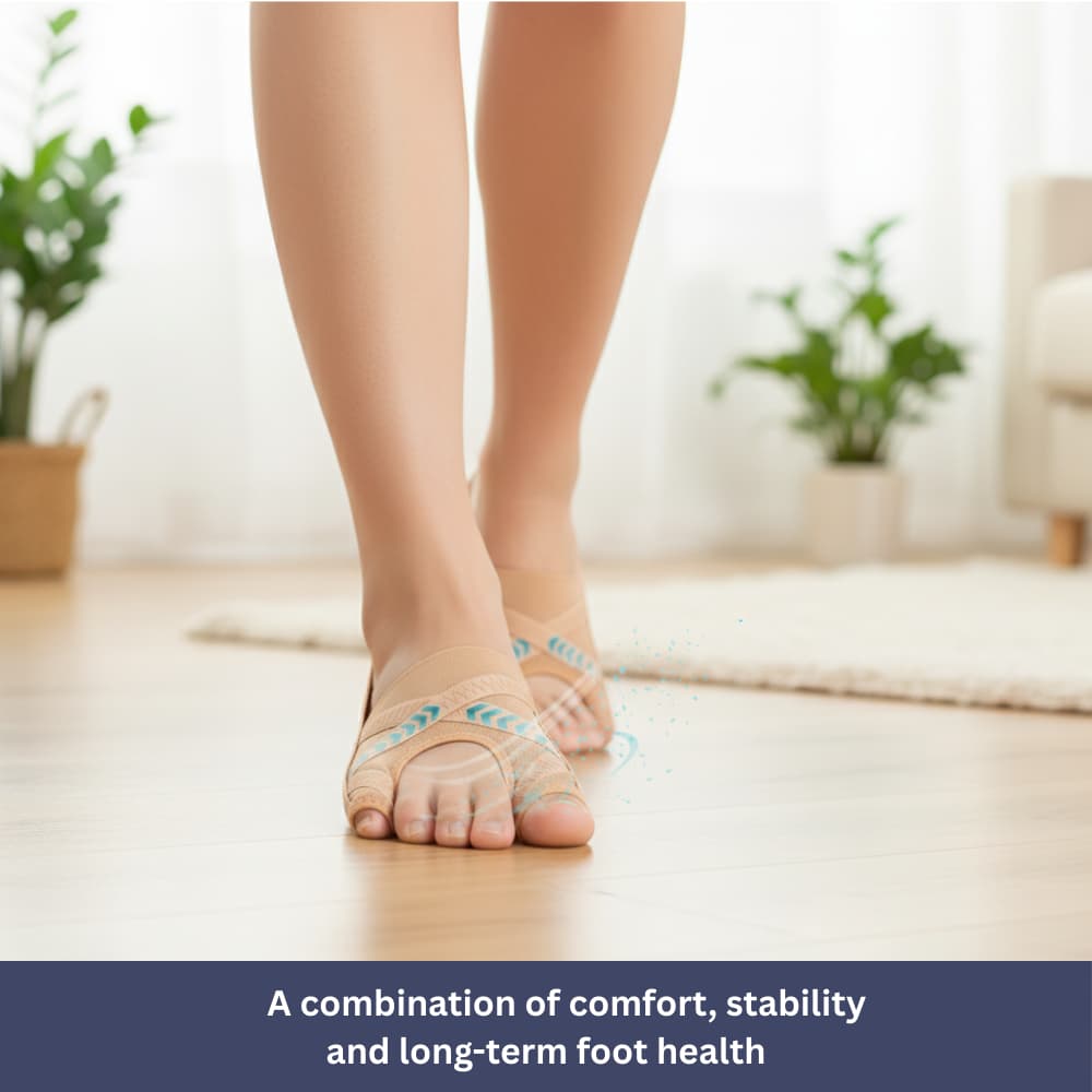This helps correct misalignment, reduce pain, and improve overall foot alignment during daily activities, in shoes, or while resting in bed.