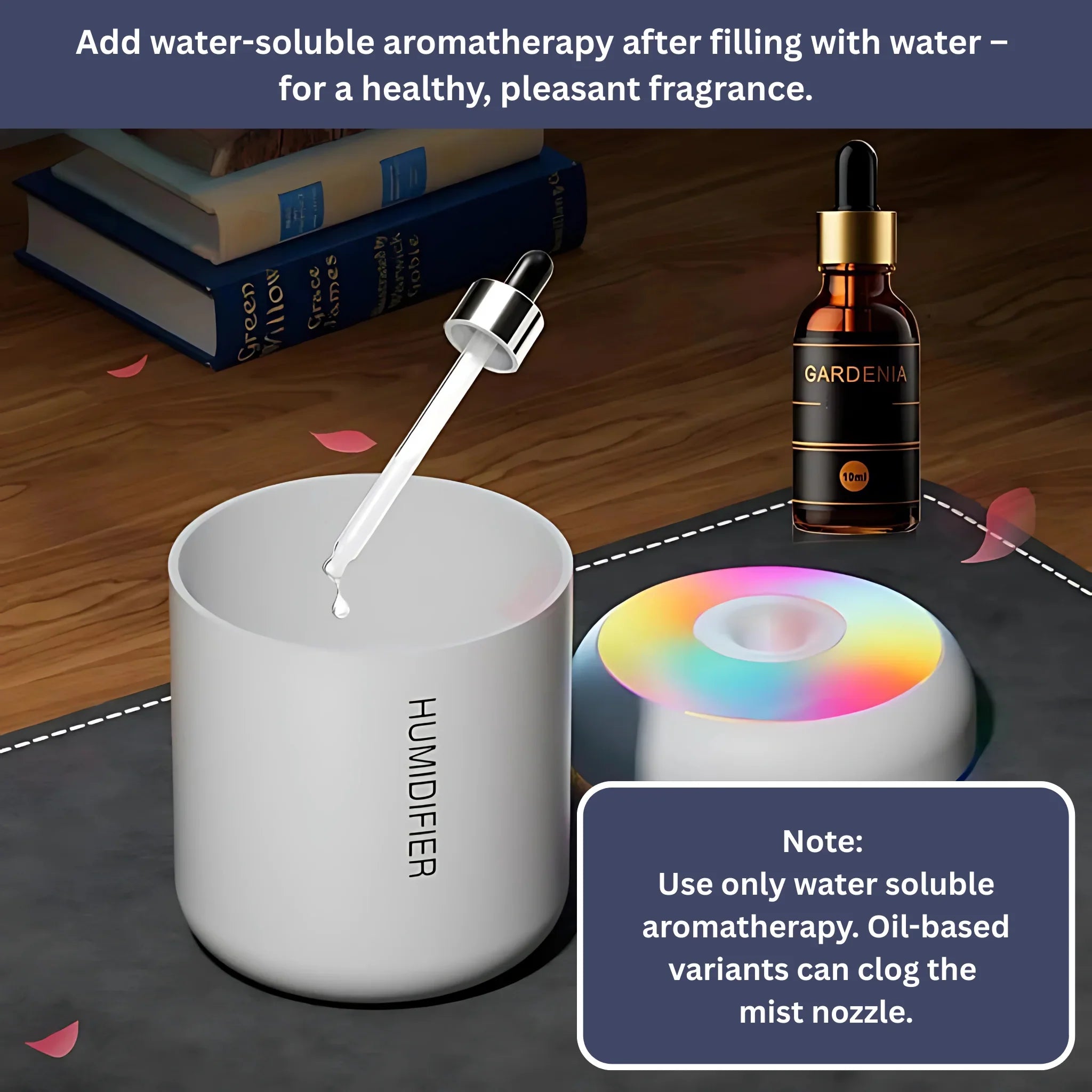 After filling your humidifier with water, simply add water-soluble aromatherapy oils to enhance your environment.